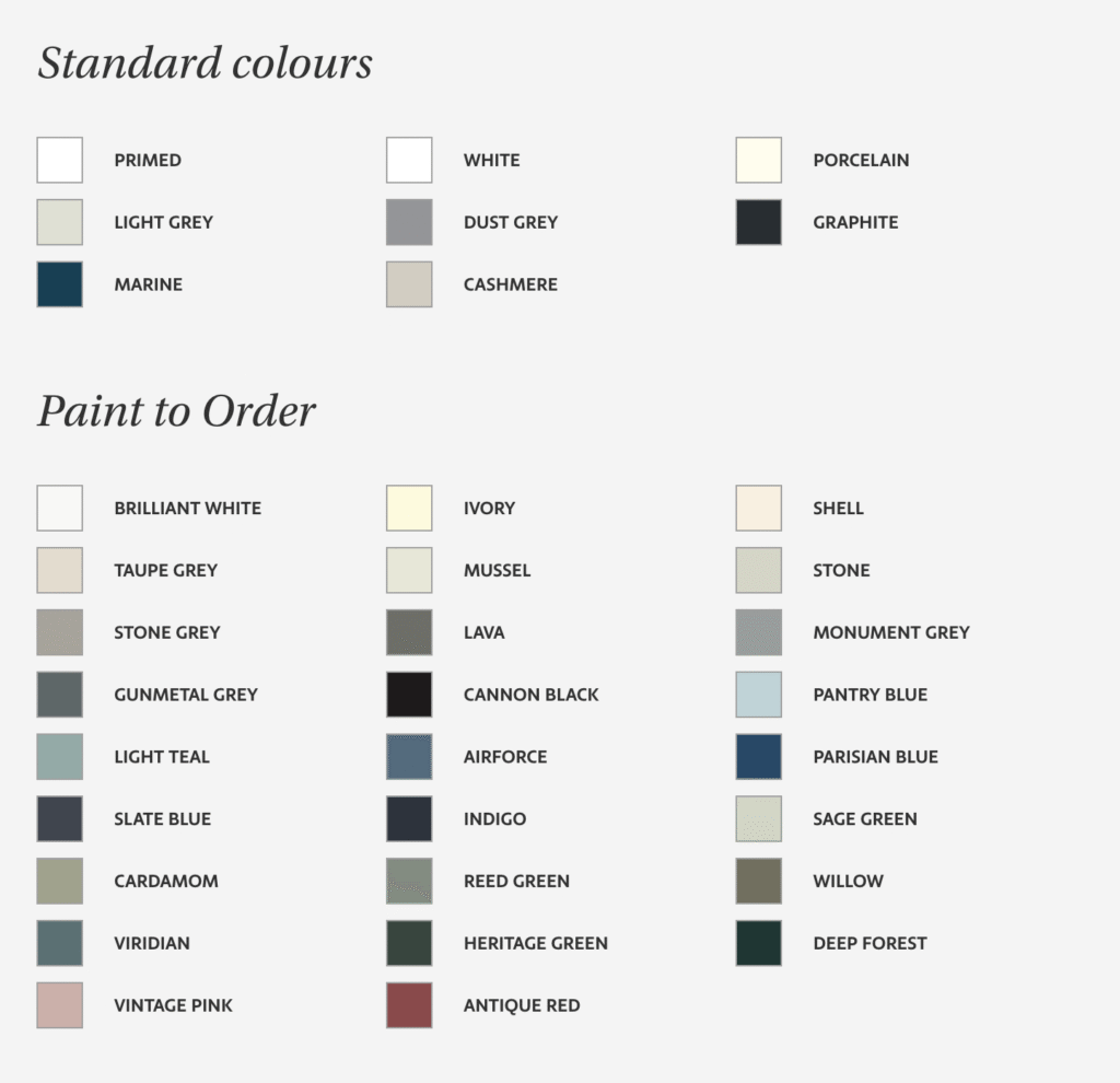 Colour Options: Choose from a palette of 32 on-trend colours, such as Brilliant White, Porcelain, Ivory, Mussel, Pantry Blue, Parisian Blue, Marine, Sage Green, Light Grey, Dust Grey, Stone, Lava, and more. For a personalised touch, We offer a Colour Match Service, allowing you to match any RAL or BS colour reference.