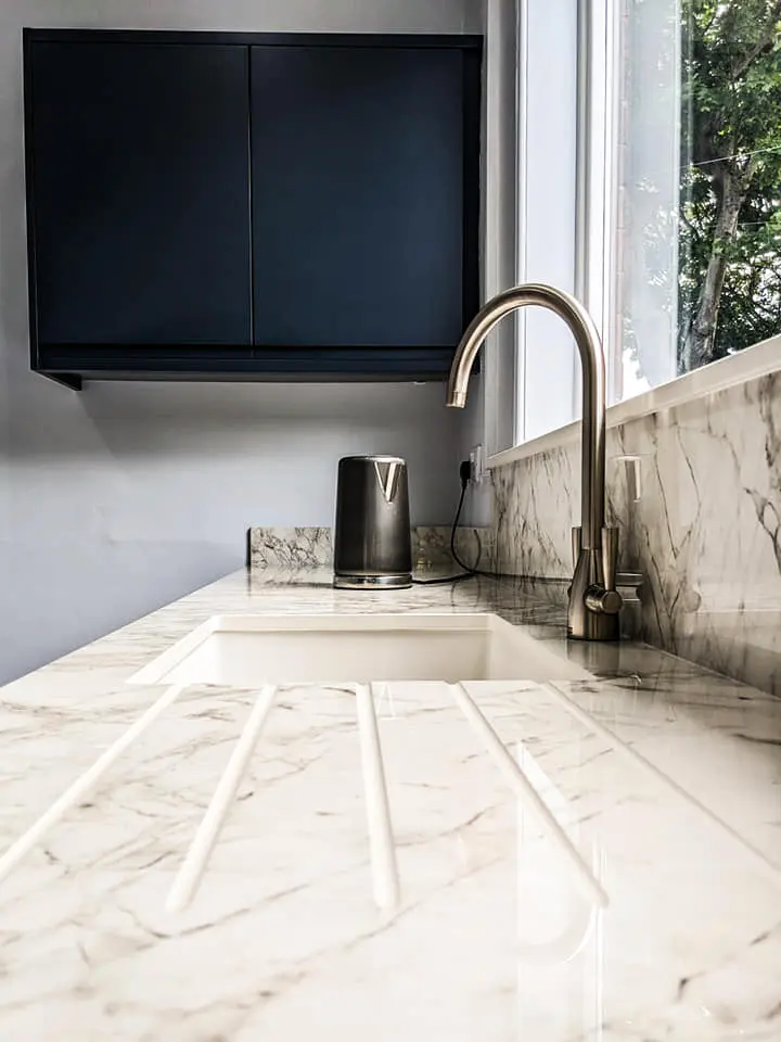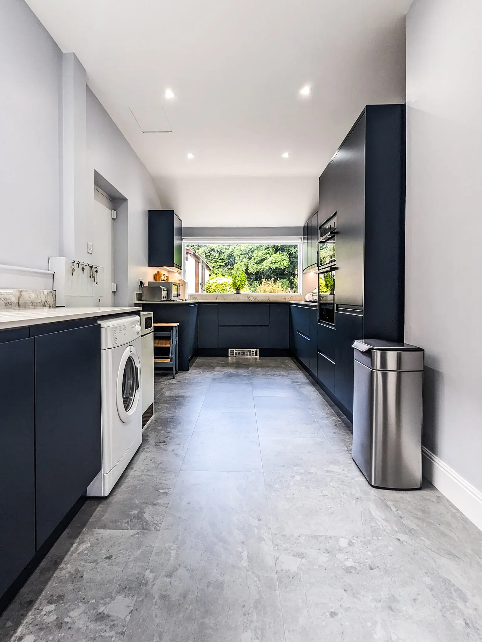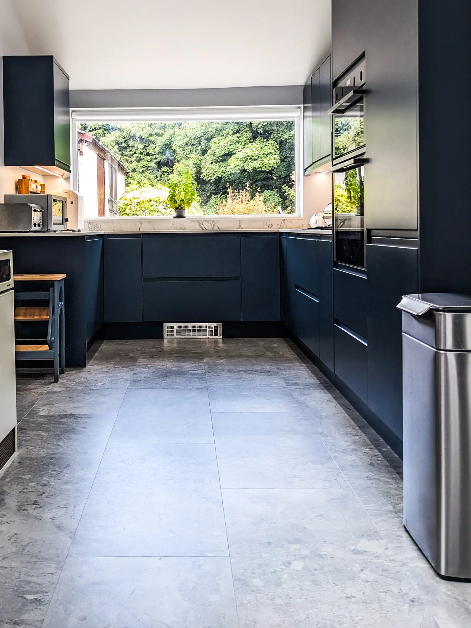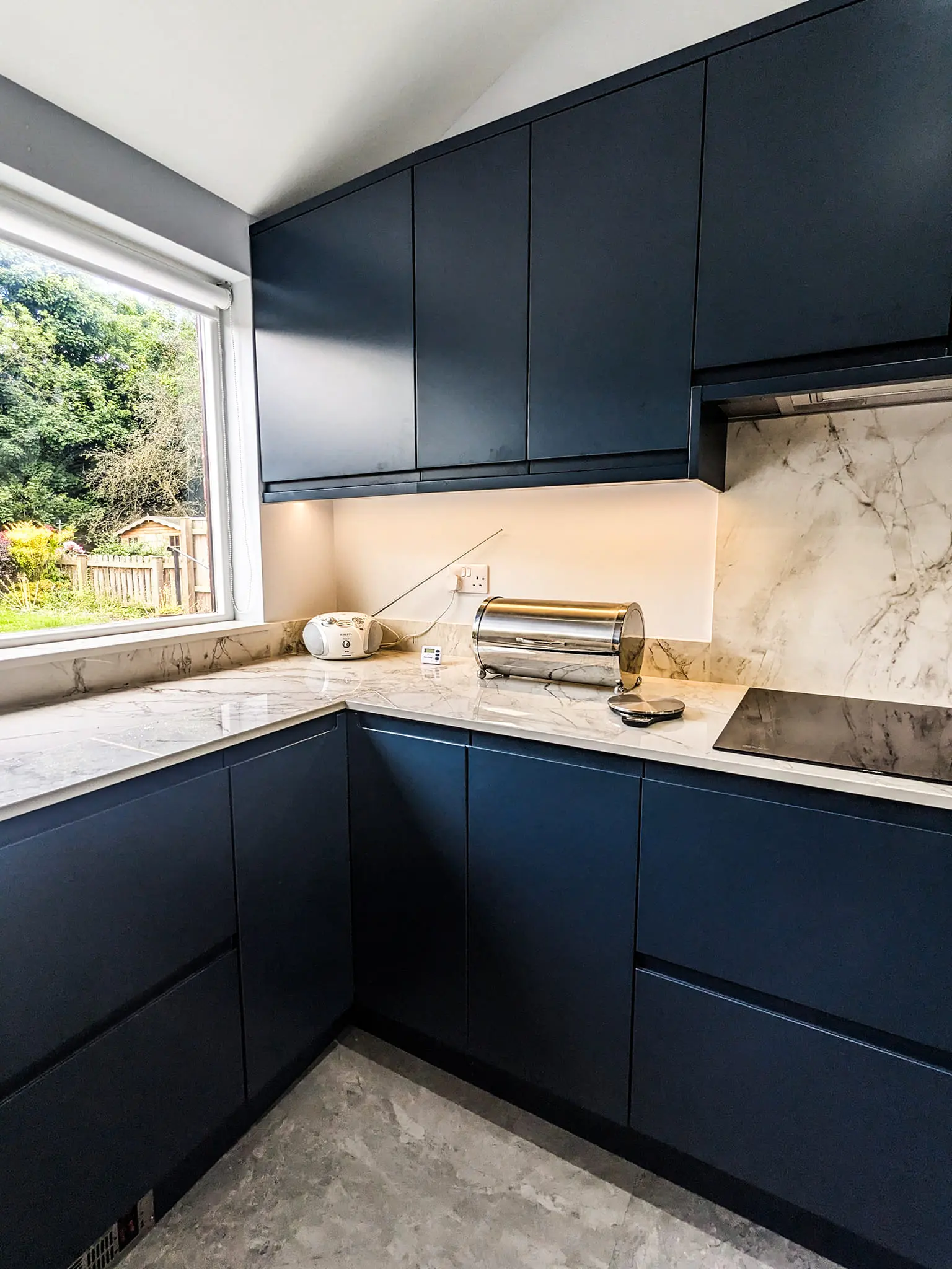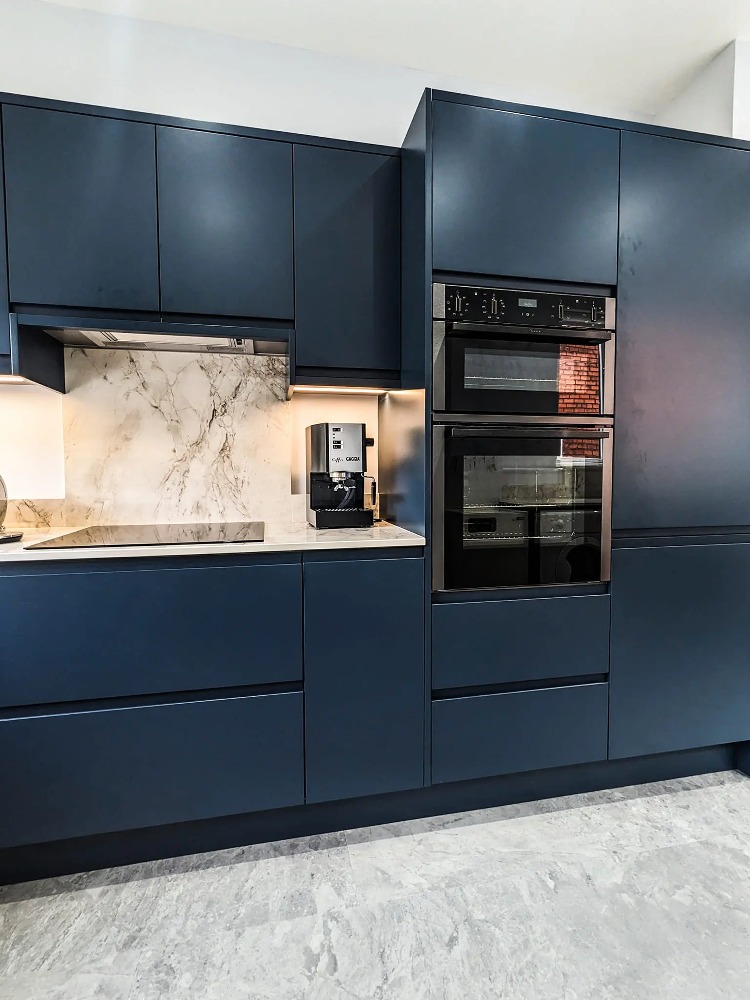 Design & Construction: The door is a 22mm thick slab with an integrated J-handle, constructed from high-quality MDF. This design ensures a seamless, handle-free appearance that enhances the kitchen’s streamlined look.